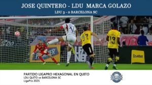 El 17 de octubre de 2025, el estadio Rodrigo Paz Delgado fue testigo de una noche mágica. Liga de Quito se enfrentaba a Barcelona SC en la segunda fecha del hexagonal final de la LigaPro. Con el marcador ya a favor de los albos por 2-0, la tensión seguía en el aire: el Ídolo intentaba reaccionar a pesar de jugar con un hombre menos tras la expulsión de Aníbal Chalá, mientras la hinchada local clamaba por un gol que sellara el destino del partido. Fue en el minuto 70 cuando José Quintero, con la calma de un veterano y la precisión de un cirujano, lanzó un disparo espectacular desde fuera del área. El balón voló directo a la escuadra, desatando la locura en Quito y asegurando la goleada 3-0. José Quintero marca golazo